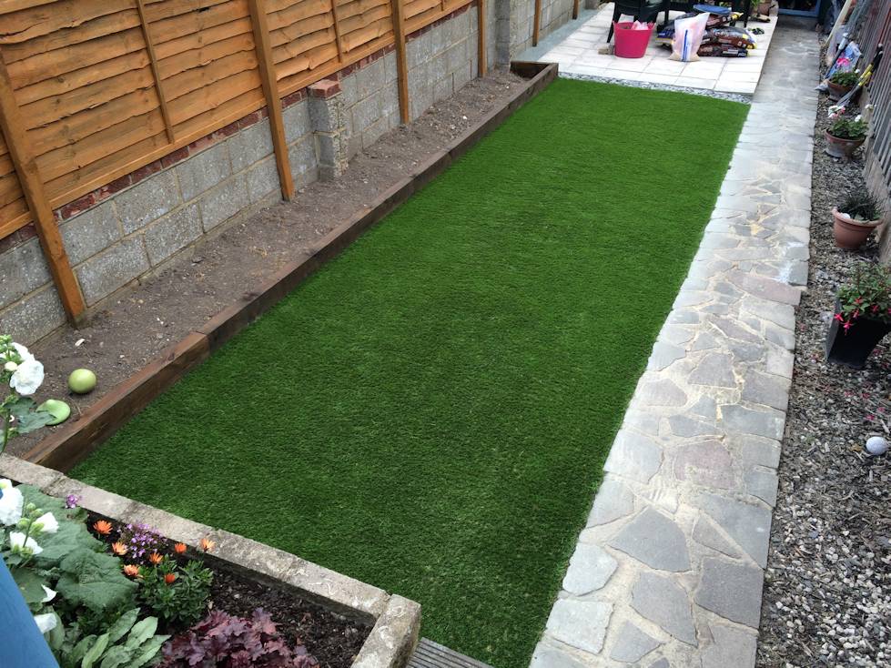 A garden make-over achieved by removing an old lawn, which had grown into clumps, installing a retaining wall, for a flower bed, and laying an aritifical-grass lawn.