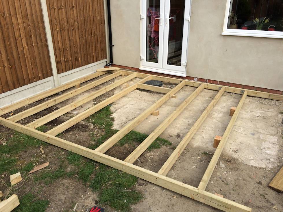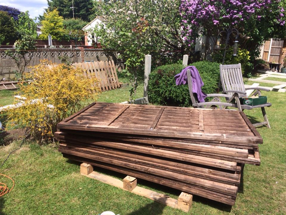Where the garden's 'patio' area was in such a state - old concrete, type 1 etc - a quick solution was to deck the area. For this build, new timber was needed for the carcass, but re-cycled decking was used for the deck itself.