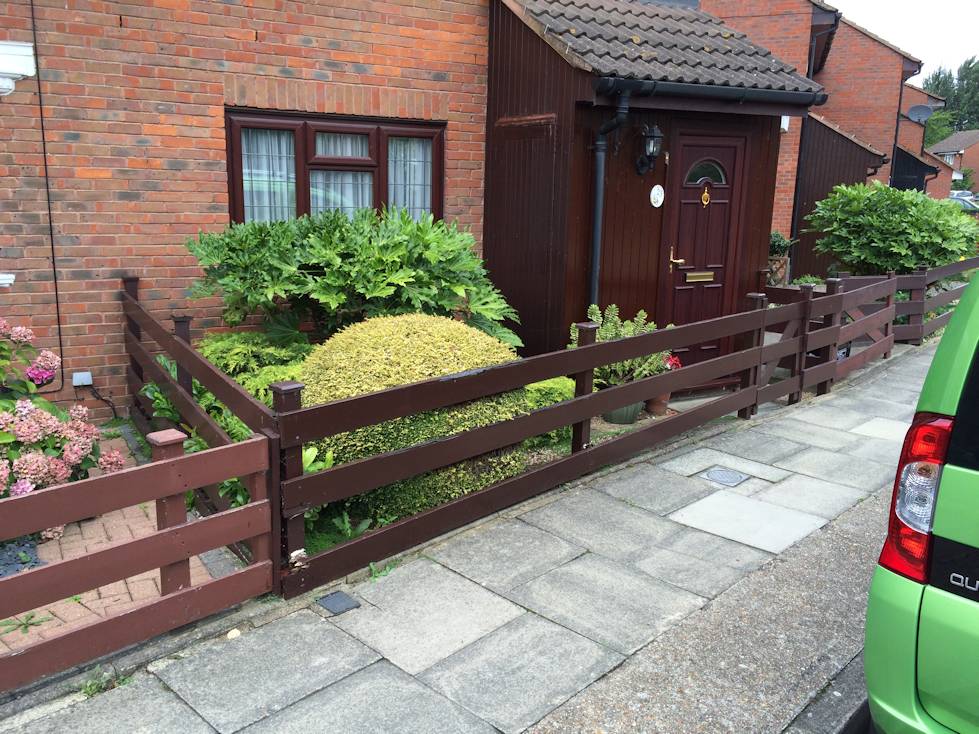 Two neighbours' fences had become rotten, but they both wanted to keep to original design. Therefore, all rotten wood was removed and the main part of the fence, including gates, were re-newed using decking boards (second picture taken halfway though painting with wood preserve).